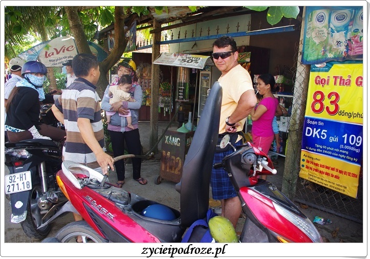 Tankowaliśmy nasz motorek, jak nie z butelki, to z pomocą dziwnych urządzeń. Trzeba było powiedzieć ile się chce litrów, pan pompował, a następnie nalewał do motorka.