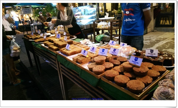 Kiedy wracaliśmy do Luang Prabang udawaliśmy się na Nocny Bazar, który był rozkładany na głównej ulicy w godzinach wieczornych. Można było tutaj zakupić pamiątki, ubrania, czy praktyczne gadżety lub skosztować różnych smakowitości. Od różnych dań regionalnych, jak laotańska kanapka, mięs, kiełbas, rollsów zaczynając, a na pierogach i owocach kończąc. Królowały również słodkości, które zachęcały, aby je skosztować.