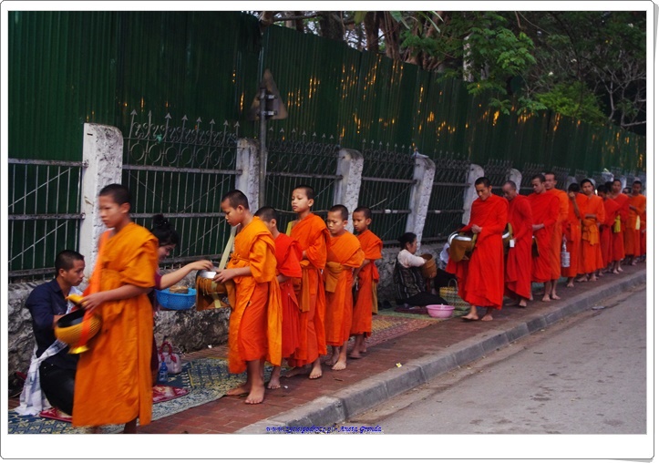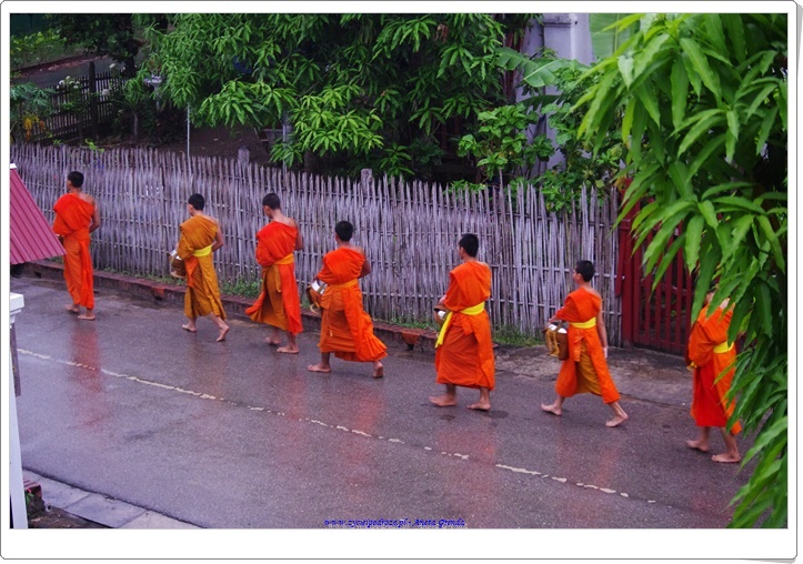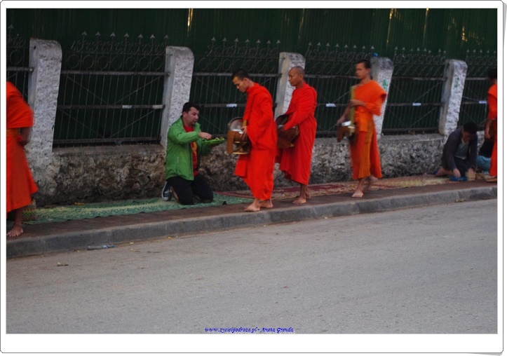 Wczesnym rankiem z kolei braliśmy udział we wręczaniu darów mnichom w postaci jedzenia. Procesja każdego dnia wygląda magicznie. Boso idący mnisi, czy to w słońcu, czy też w deszczu, wyglądają uroczo, a wszystko jest takie mistyczne.To bardzo piękna tradycja. Już drugiego dnia wiedzieliśmy, że po usłyszeniu gongów za kilka chwil można ustawić się na ulicy z koszem z potrawami i podarować je mnichom. Ponadto mieszkańcy w bocznych uliczkach szykują każdego dnia dary dla mnichów, po które oni i tam się udają. Większość z nich żyje bardzo skromnie, ale są i tacy, którzy korzystają z nowoczesnych rozwiązań.