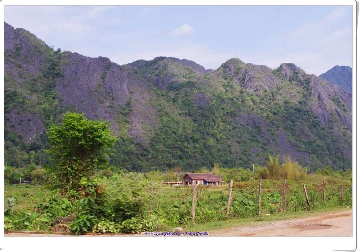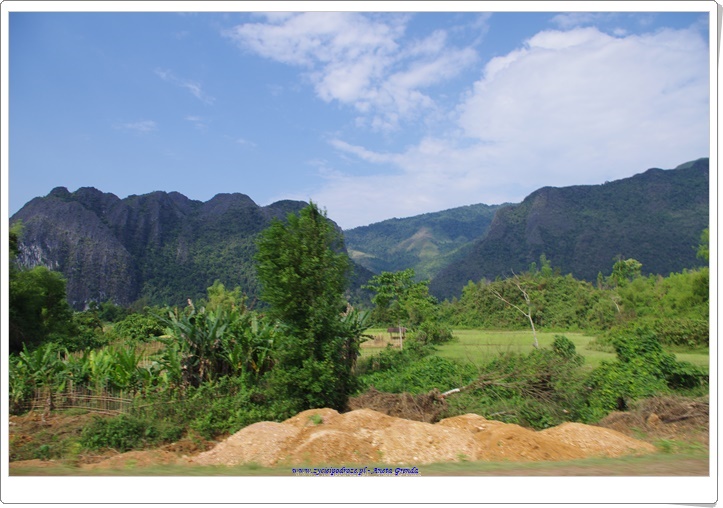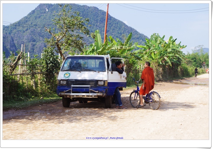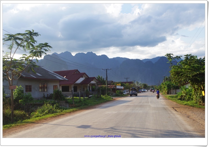 Droga do Vang Vieng była niezwykła i pełna wrażeń. Jechaliśmy pomiędzy górami, drogami, które były narażone na osuwanie się kamieni, z których część była dopiero w budowie lub w remoncie. Przypominały mi się drogi jakimi przyszło nam podróżować w Himalajach, w czasie wyprawy do Nepalu, choć z tą różnicą, że tutaj raczej był asfalt, a nie skały i piach oraz lepsze auta. Do celu dojechaliśmy szczęśliwie.