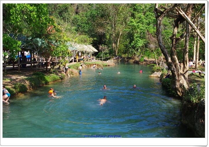 Odwiedziliśmy też jaskinię Tham Poukham, która położona jest obok Blue Lagoon, będącej atrakcją tego miejsca. Jaskinia jakoś szczególnie nas nie zachwyciła, gdyż już wcześniej widzieliśmy piękniejsze, ale my zawsze lubimy takie miejsca. Skorzystaliśmy z okazji i wykapaliśmy się w lagunie oraz oddaliśmy się różnym zabawa w wodzie korzystając z huśtawek i drzewa, z którego można było skakać. Spędziliśmy tam przyjemnie czas i ruszyliśmy w dalszą drogę.