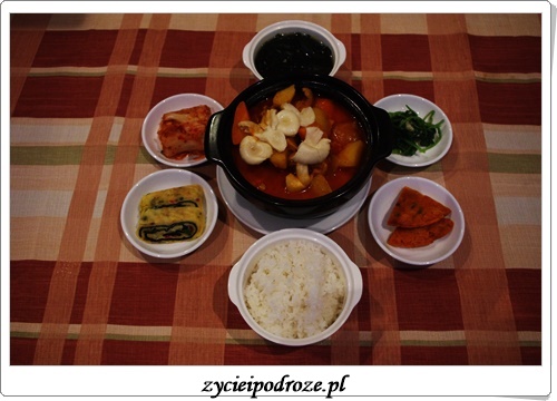 Osobiście oprócz kimchi próbowałam Dak Bokkeum Tang, pikantne danie składające się z kawałków kurczaka połączonych z marchewką, ziemniakiem, pikantnymi przyprawami i grzybami.