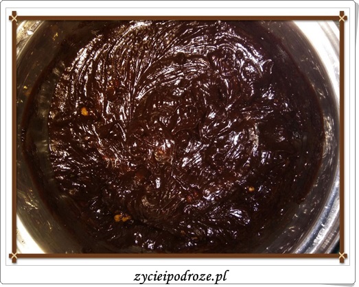 Czekoladę, masło i cukier puder lub miód roztapiamy w garnku postawioym na wolnym ogniu. W końcowej fazie podgrzewania dodajemy jajka i zdejmujemy z kuchenki. Dorzucamy orzechy i ewentualnie wlewamy aromat, bądź odrobinę alkoholu i pozostawiamy do ostygnięcia. Można na chwilę wstawić po wystudzeniu do lodówki. Masa powinna mieć gęstą konsystencję.