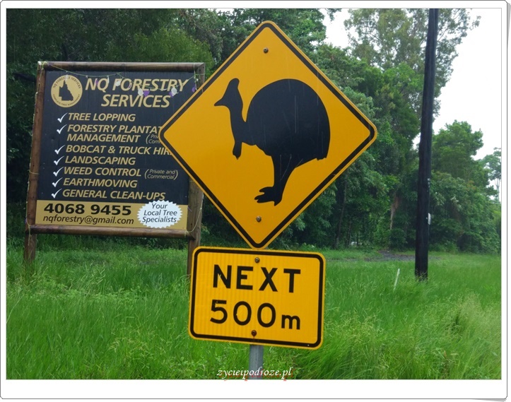 Przemierzając przez Australię spotyka się znaki drogowe, które w innych miejscach nie sa popularne. Uwaga Kangur! Koala! Kazuar! i tym podobne 🙂 I choć wschodnie wybrzeże charakteryzuje się słoneczną aurą my codziennie doświadczaliśmy deszczu, burz, a nawet ulew. Australia ich jednak potrzebuje, gdyż ponoć w ciągu ostatnich dwóch lat było ich zbyt mało. My dość często modyfikowaliśmy nasze plany z ich powodu. Jednakże takie deszcze, może poza ulewami, były na ogół przyjemne. Przypominały nam burze i aurę tuż po nich z czasów dzieciństwa, gdy powietrze aż pachniało po letnim deszczyku. Tak do tej pory jest w Australii.