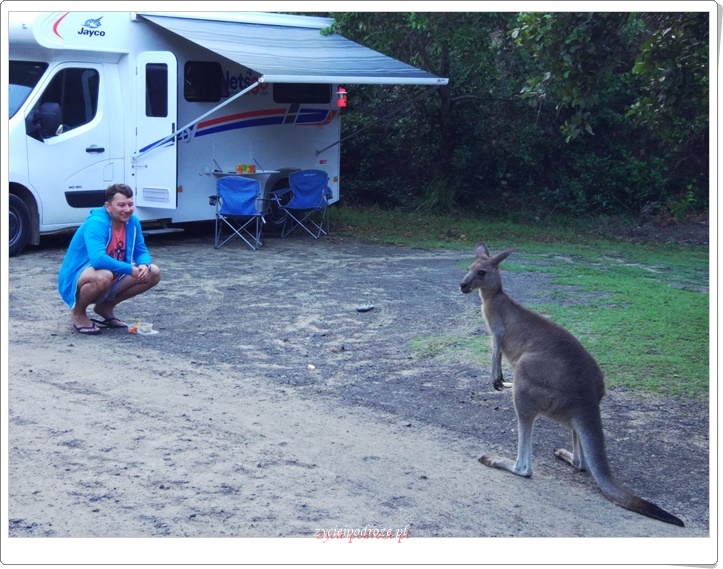 Tym razem na nocleg zatrzymaliśmy się naszym domem na kółkach w uroczym miejscu, ni to dżungli, ni to buszu, położonym tuż przy plaży, czyli w Smoky Cape Campground położonym w Hat Head National Park. Spędziliśmy tam urocze magiczne wieczorne chwile nad morzem, wsłuchiwaliśmy się w odgłosy dochodzące od strony drzew, a rano czekała na nas niespodzianka. Odwiedziły nas kangury mieszkające w tych okolicach. Można powiedzieć, że się nieco zaprzyjaźniliśmy, gdyż towarzyszyły nam cały poranek i skosztowały naszego śniadania. Było to ciekawe i radosne doświadczenie.