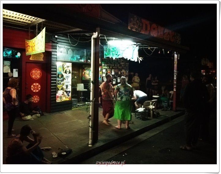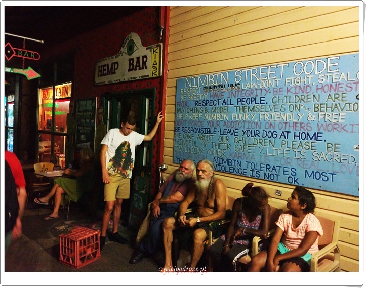 Udając się w dalszą drogę mieliśmy w planie zatrzymać się na postój w okolicach Balliny, czy też Byron Bay, ale kampingi były wręcz oblężone, gdyż był to czas weekendu, do tego kończący wakacje, więc dotarliśmy do Nimbin, które i tak było w planach. Po zaparkowaniu udaliśmy się na spacer do tego hippisowskiego miasteczka zobaczyć, jak wygląda w nim życie wieczorne, albo i nocne. Ku naszemu zaskoczeniu większość lokali zamykano około 21.00 więc niełatwo już po tej godzinie coś zjeść. Ponieważ tego wieczora nie gotowaliśmy kolacji, gdyż miejsce, gdzie parkowaliśmy było podmokłe po ulewie i pełne komarów, więc załapaliśmy się na ostatnią tego wieczora włoską pizzę prosto z pieca, zresztą bardzo smaczną i serwowaną faktycznie przez Włocha mieszkającego w Nimbin od kilku lat. Na jedzeniu, polsko-włoskich pogaduszkach minęła nam część wieczoru. Następnie spacerując po miasteczku spotykaliśmy hippisów i nie tylko, spędzających razem czas i bawiących się radośnie. Przy muzyce granej na żywo i pysznym piwie australijskim spędziliśmy resztę wieczoru. Miasteczko rodem z westernu i zamieszkałe przez hippisów okazało się przyjemnym, spokojnym miejscem, choć o specyficznym klimacie, w którym można spędzić miło czas.