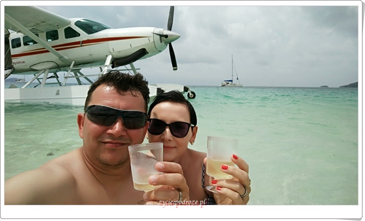 Z Yeppoon udaliśmy się w stronę Airlie Beach, z którym wiązaliśmy nasze różne plany. I choć pogoda nas nie rozpieszczała, gdyż padało bardzo, momentami ulewnie, udało nam się zrealizować choć część z nich. Polecieliśmy hydroplanem nad Wielką Rafę Koralową- The Great Barier Reef i mogliśmy podziwiać jej niezwykłość i wyjątkowość. Przekonaliśmy się, że rafa w kształcie serduszka – Heart Reef istnieje naprawdę. I choć może nie jest tak duża, jak to pokazują różne zdjęcia, czy filmy, jest fascynującym zjawiskiem. Lot nad rafą koralową był niezwykły, a wylądowanie tuż przy plaży Whitehaven Beach było magicznym doświadczeniem. Mogliśmy w ten sposób pobyć choć kilka chwil na Whitsunday Island, nacieszyć się ciepłym Morzem Koralowym, białym piaseczkiem, a nawet skosztować szampana ciesząc się tą chwilą. Tak bardzo chciałam tu być, a mój mąż sprawił, że przygoda z rafą koralową i wyspami położonymi tuż obok przerosła moje oczekiwania.