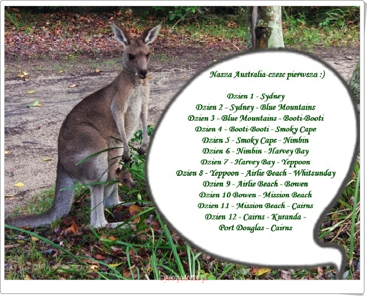 O niezwykłej, fascynującej i zaskakującej Australii pisałam w poprzednim wpisie https://www.zycieipodroze.pl/2017/02/08/przygoda-w-australii-czyli-spelniajace-sie-dzieciece-marzenie/, a teraz będzie słów kilka o trasie, którą pokonaliśmy w ciągu 12 dni. Odwiedziliśmy wiele miejsc i przejechaliśmy 3800 kilometrów. Naszą podróż wzdłuż wschodniego wybrzeża rozpoczęliśmy w Sydney. Tam czekał już na nas wynajęty wcześniej dom na kółach. Służył on nam jako dom i środek transportu w drodze. Jego wybór okazał się strzałem w dziesiątkę. Od kilkunastu lat myśleliśmy o tej formie podróżowania, a teraz stała się ona możliwa. Do przemieszczania się kamperem potrzebna jest infrastruktura, a ta w Australii jest znakomita. Niewątpliwie ten najmniejszy kontynent jest wprost stworzony, aby przemierzać go domem na kółkach. Nasza trasa, jak wspomniałam wcześniej, liczyła 3800 kilometrów, a przemierzenie drogi z Sydney do Cairns, a właściwie i Port Douglas oraz zwiedzanie zajęło nam 12 wyjątkowych, pięknych i magicznych dni. Poniżej zamieszczam mapkę z naszą trasą, która wiodła przez ogromne przestrzenie, niezwykłe drogi i okalającą wszystko dookoła wyjątkową przyrodę.