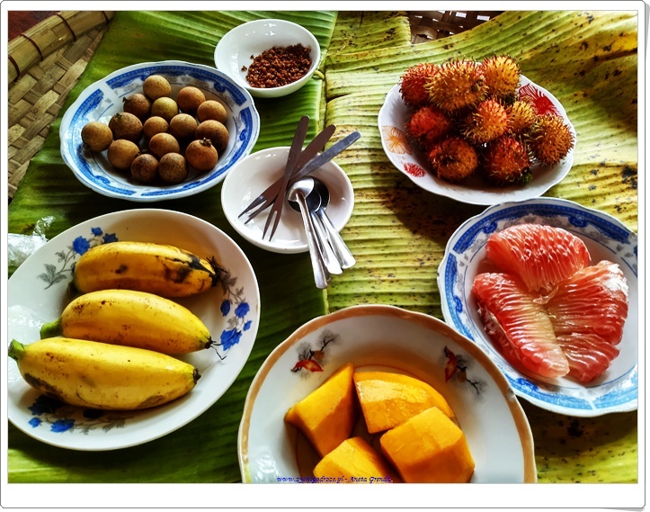 Delta Mekongu ma bardzo dużo do zaoferowania. Poza tym, że możemy ją przemierzać łódkami zarówno dużymi, jak i takimi na których wiosłują pojedyncze osoby oraz atrakcjami turystycznymi kusi także pysznym jedzeniem. Zarówno owoce, jak i specjały kuchni Delty Mekongu nas zachwyciły. Bardzo pyszna jest ryba smażona i trzymana nad żarem. Jej nazwa wietnamska to Cá tai tượng. Występuje w bagnach, jeziorach i rzekach Azji Południowo-Wschodniej, między innymi w Delcie Mekongu. Potocznie nazywana jest ,,Słoniowe ucho,,. Świeżo przyrządzona smakuje wybornie. Dodatek zupy z kurczaka z makaronami i mięs w sosie własnym, niemalże jak w Polsce, doskonale się z nią komponuje. Nie należy zapominać o spring rollsach, krewetkach i zieleninie, które połechtały miło nasze podniebienia. Zarówno przekąska z owoców, jak i główny posiłek tego dnia, smakowały wybornie.