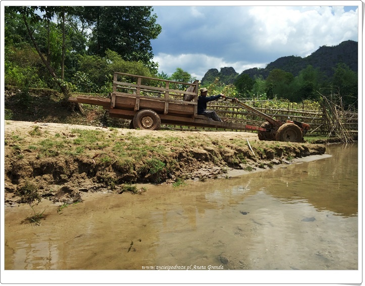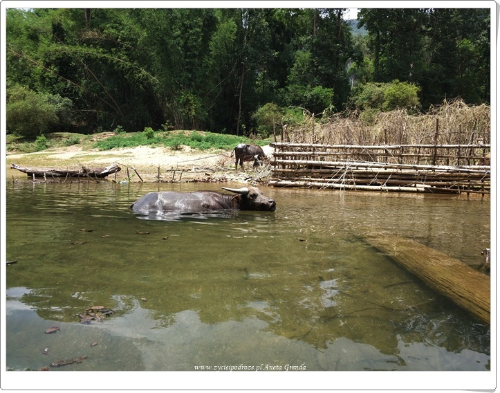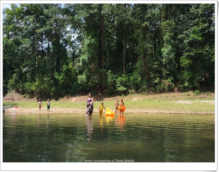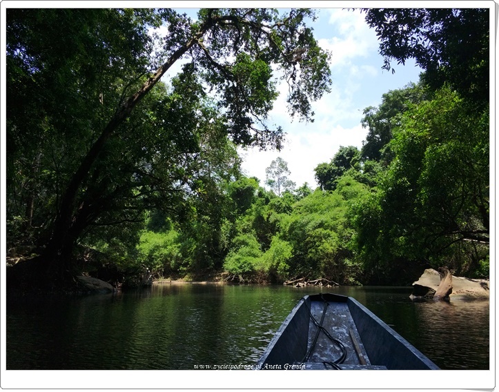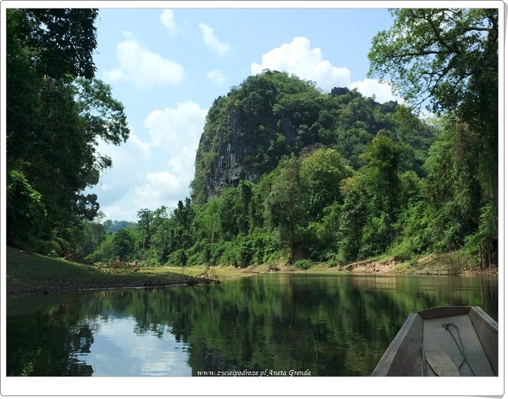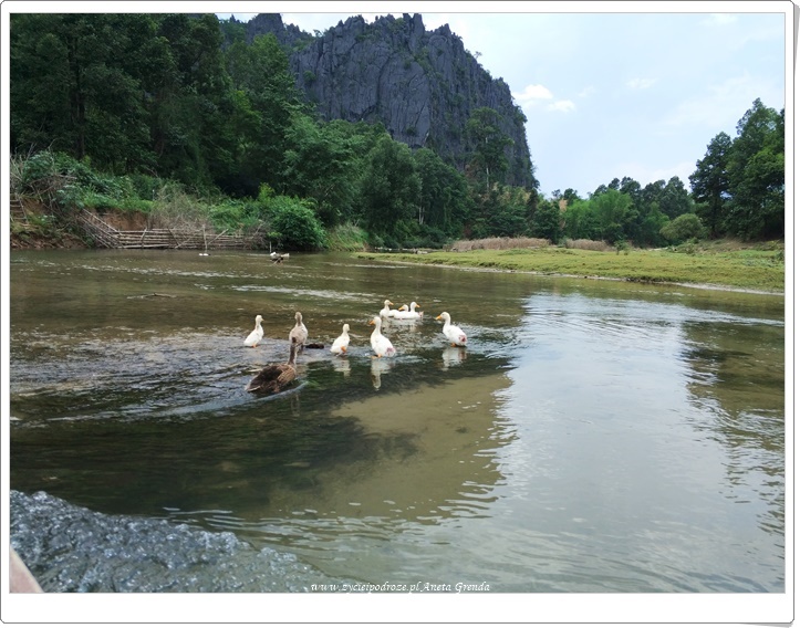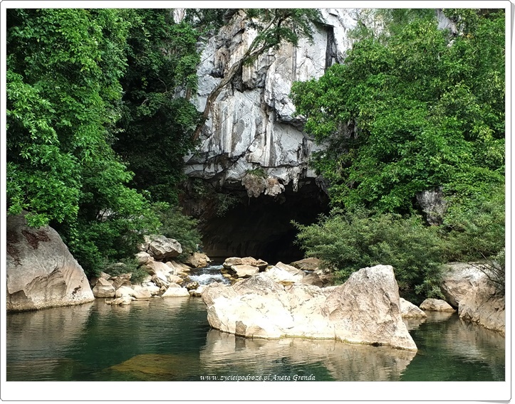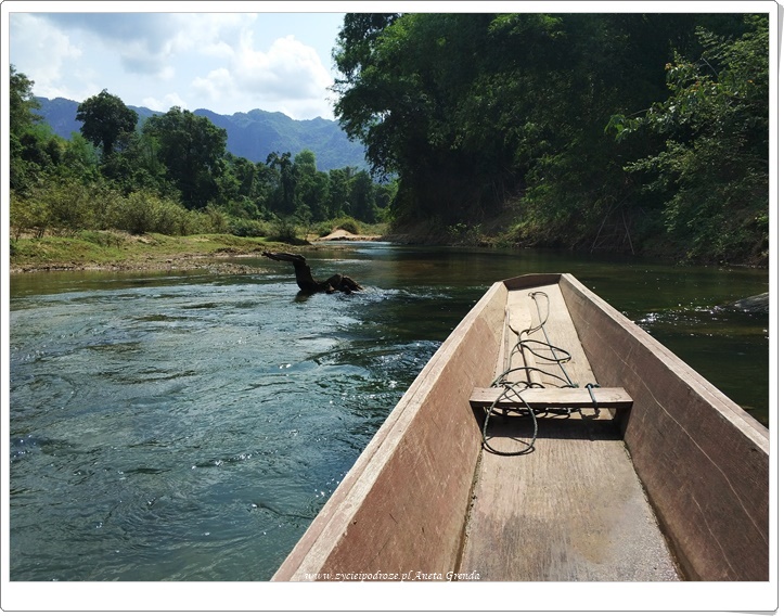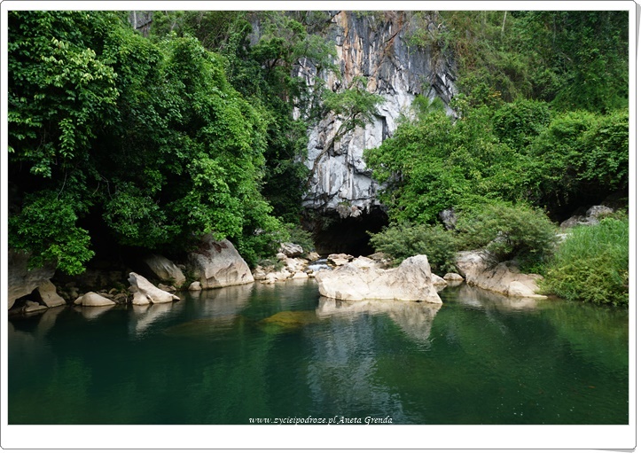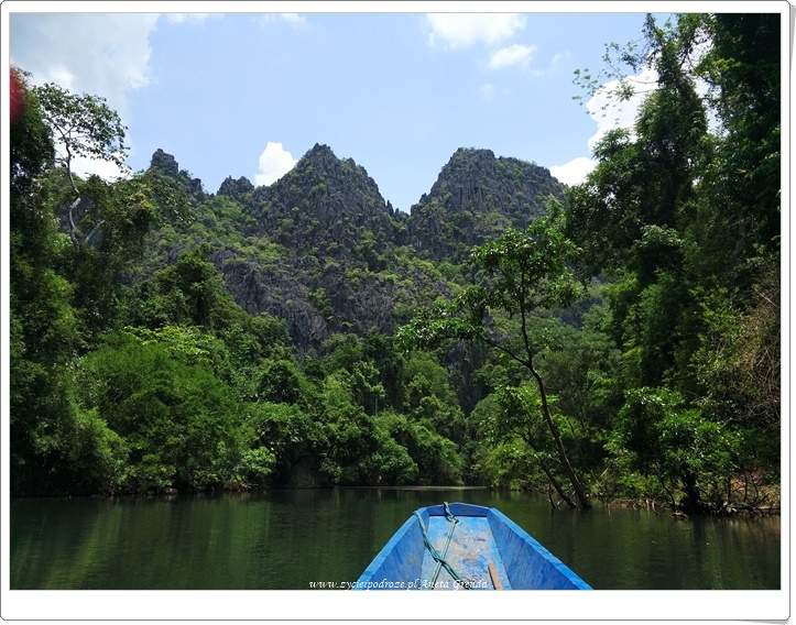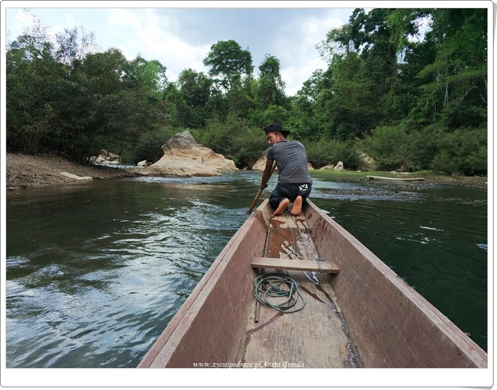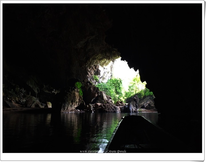 Laos to kraina jaskiń. Znajduje się ich tutaj bardzo dużo, wiele jeszcze dotąd nie zbadanych. Kong Lor jest jedną z nich, choć niewątpliwie wyjątkową ze względu na przepływającą przez nią rzeką podziemną Nam Hinboun. Jest to krasowa jaskinia wapienna położona w Phou Hin Poun National Biodiversity Conservation Area. Park Narodowy leży w pięknej, choć dość biednej prowincji Khammouane. Jaskinia znajduje się około 130 kilometrów na północ od Thakhek. Dotrzeć do niej można podróżując pośród pól tytoniowych i ryżowych, bądź płynąc łódką przez dżunglę. Już sama droga, która prowadzi do jaskini, jest niezwykła. Tak, jak wspomniałam, można dojechać wiejską drogą z Ban Khoun Kham lub dopłynąć łodzią z wioski Ban Tiou, co my uczyniliśmy. Z resztą była to bardzo dobra decyzja, gdyż to, co zobaczyliśmy urzekło nas bardzo. Łódka zabrała nas ze Spring River Resort. Podróż była niezwykła. Poziom wody bardzo niski. Łódka pomimo starań sternika nierzadko grzęzła w piasku, bądź uderzała o kamienie i konary drzew leżące na dnie. Aż niewiarygodne, że przewodnicy tak dobrze radzą sobie w tych warunkach i potrafią tak manewrować, aby nic nie uszkodzić i dowieźć wszystkich bezpiecznie do celu. To wyjątkowe doświadczenie dla nas, widoki niezwykłe i spotkania z ludźmi żyjącymi tutaj jak przed wiekami. Czas się tutaj zdecydowanie zatrzymał. Odnieśliśmy wrażenie, że cofnęliśmy się co najmniej o 100 lat. Ludzie mieszkający przy rzece wykorzystują ją na różne sposoby. Ze źródełek czerpią wodę pitną. W innych miejscach biorą kąpiel, czy robią pranie. Stanowi ona także miejsce zdobywania pożywienia, czy też hodowli kaczek i bawołów, których mijaliśmy wiele płynąc łódką. Rzeka Nam Hinboun w porze suchej miejscami jest bardzo, bardzo płytka, ale kiedy wpada do jaskini jej nurt jest znacznie szybszy. Osiąga nawet do 100 m³ / s przepływu. Jest dostępna tylko dla małych łodzi. Typowa łódź może pomieścić do pięciu pasażerów plus dwóch członków załogi. Jednakże na ogół płynie sternik i dwie osoby.