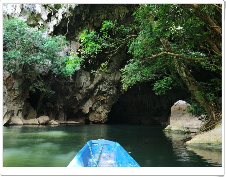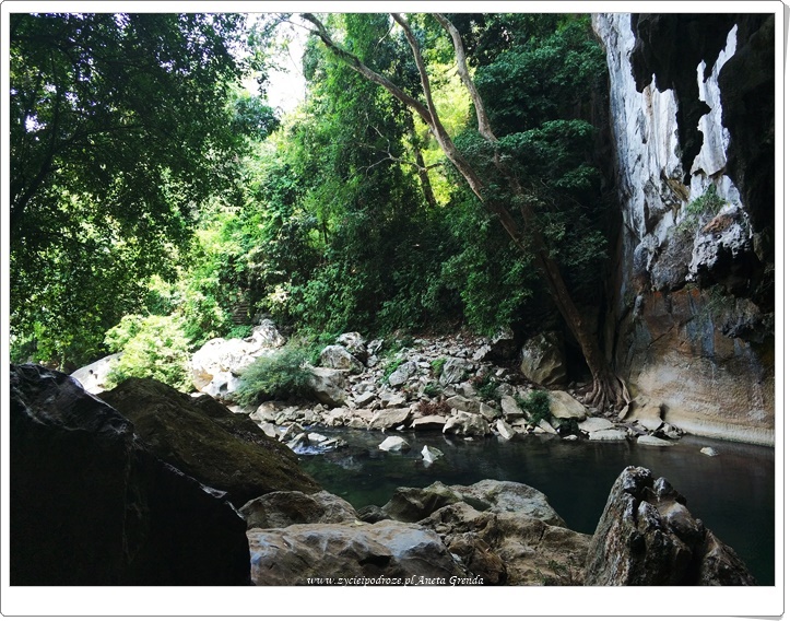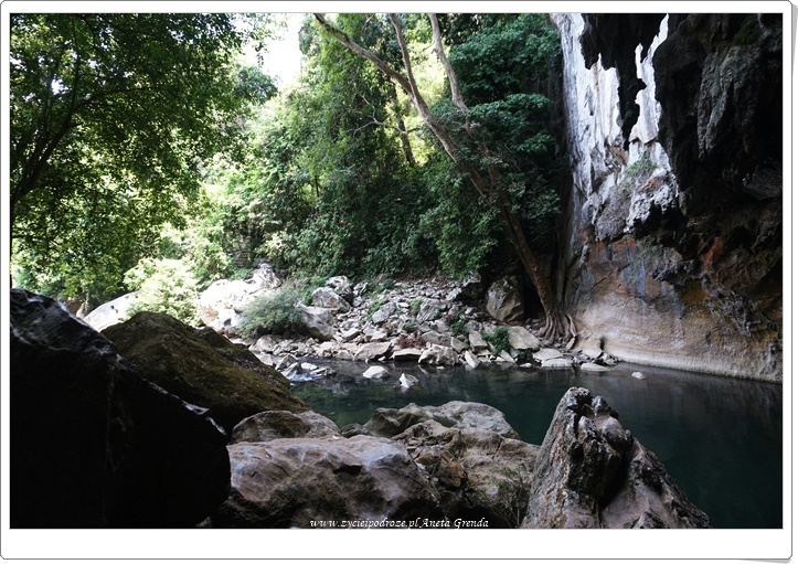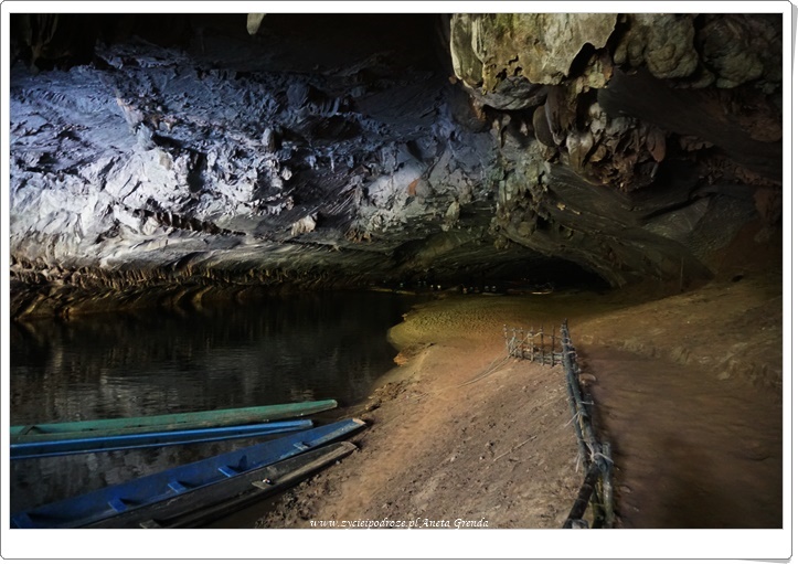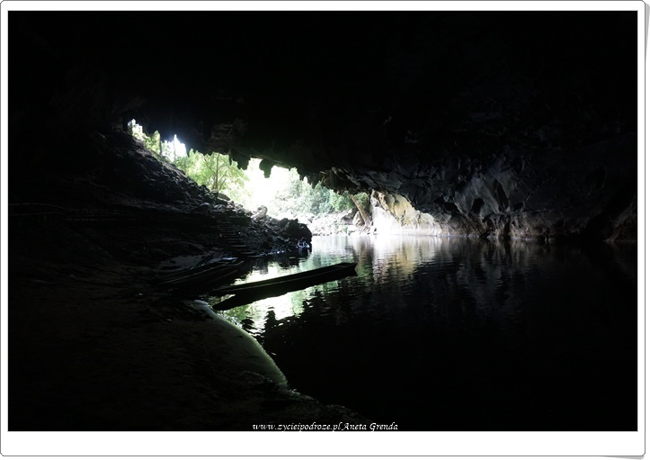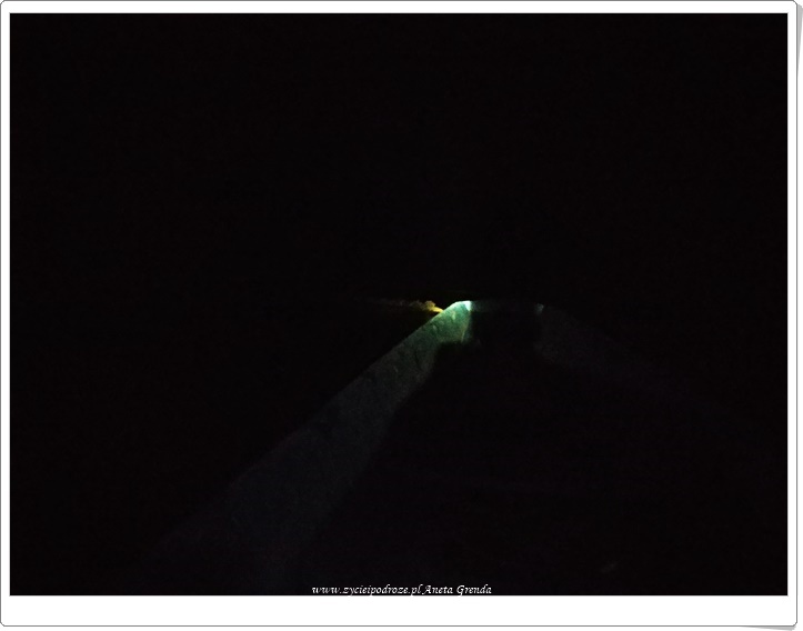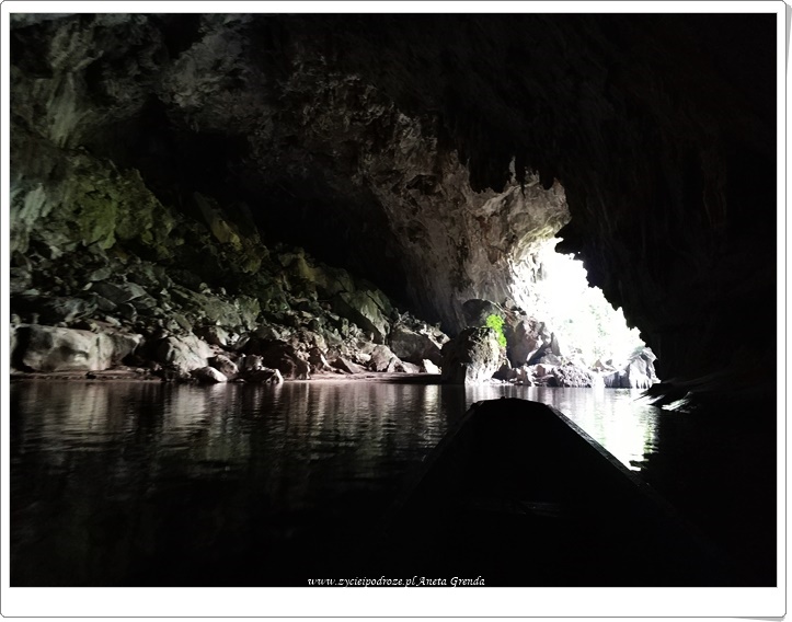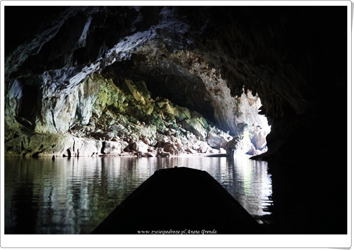 Do jaskini wchodzi się na nogach, aby później maleńką łódką popłynąć w otchłań otuloną ciemnością. Doświadczony sternik doskonale radzi sobie zarówno z prądem rzecznym, jak i brakiem światła. Jest tylko on, my, czołówki, łódka, cisza i niezwykła jaskinia spowita mrokiem. Silnik pracuje miarowym rytmem, ale czasami trzeba go wyłączyć, gdyż skały są blisko, albo woda jest zbyt płytka. Wówczas wiosła służą do poruszania. W jednym miejscu opuszczamy łódkę i przenosimy ją, gdyż napotykamy niby maleńki wodospad, ale niemożliwe jest pokonanie go nasza łupinką. To niesamowite jak dobrze nasz przewodnik zna tę jaskinię, każdy jej zakamarek. Zapewne gdybyśmy my mieli sterować bardzo szybko rozbilibyśmy się o którąś ze skał, choć sami żeglujemy, o czym pisałam w poście https://www.zycieipodroze.pl/2017/05/04/zeglowanie-czyli-poczatek-niezwyklej-pasji/. Jednakże tutaj wszystko wygląda inaczej. Płyniesz rzeką podziemną przez jaskinię otuloną mrokiem ze świadomością, że wokół i pod wodą mnóstwo skał, kamieni i zmienna głębokość wody. To już nie przelewki. Tutaj trzeba doskonale nawigować i tak jak lokalni przewodnicy znać niemalże każde miejsce w jaskini, aby bezpiecznie dotrzeć na jej druga stronę. Każdy niewłaściwy ruch mógłby bowiem spowodować wywrócenie łódki.