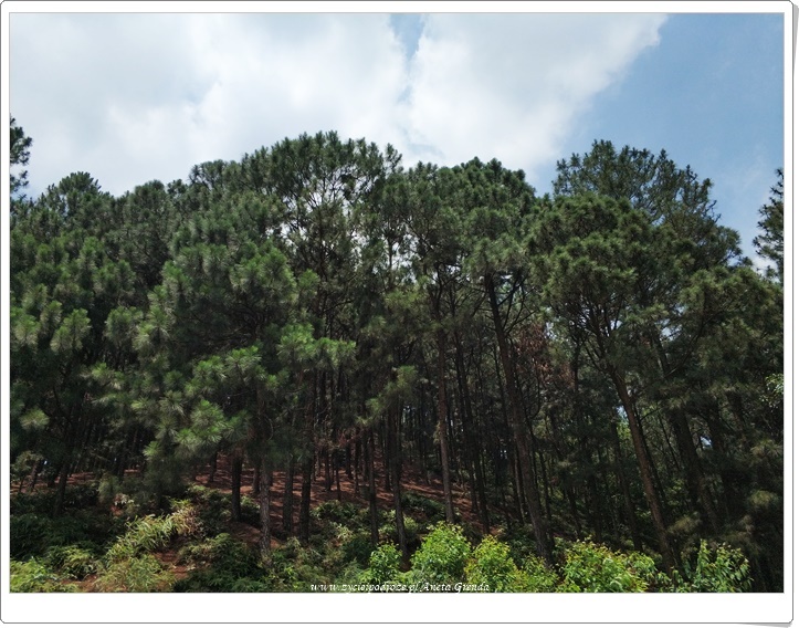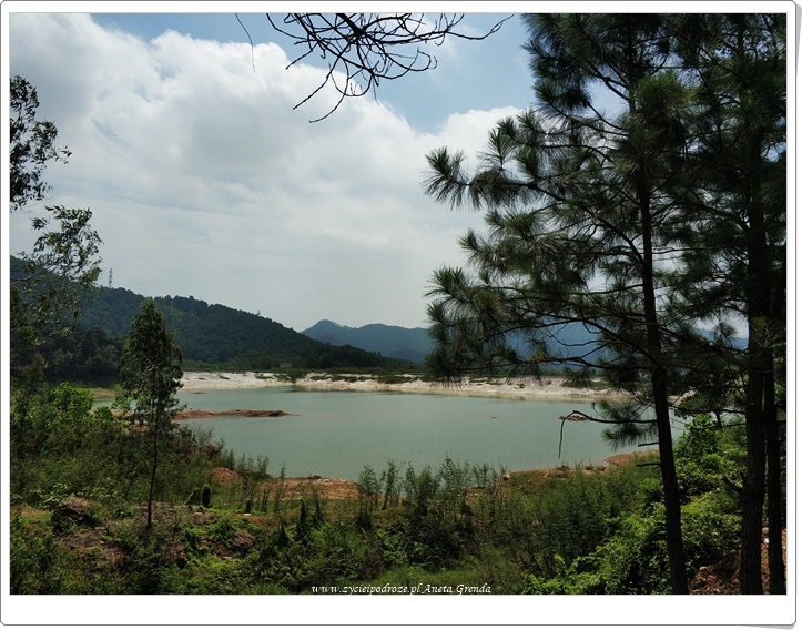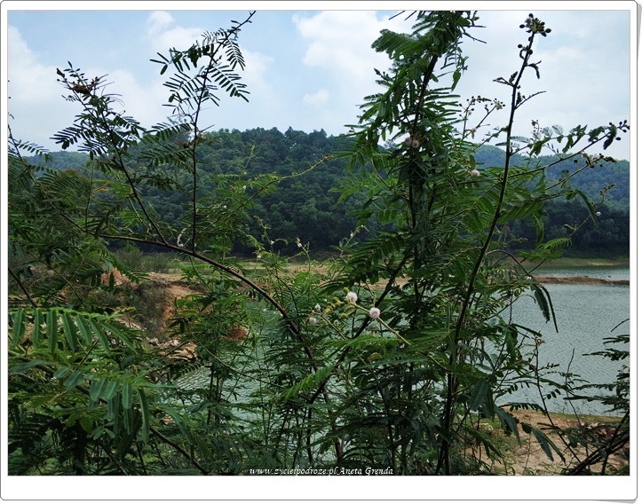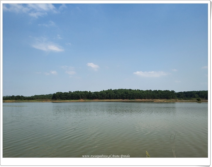 Następnego dnia pierwszym naszym wyborem było jezioro Hồ Hàm Lợn. Położone ono jest u stóp gór, z których najwyższa jest Núi Hàm Lợn nazywana niekiedy, choć nie wiem dlaczego, górą świń. Ma ona 462 metry wysokości i góruje nad okolicą. Jezioro jest niewielkie i ma kolor błękitny. Tuż przy nim znajdują się lasy świerkowe. Już się przyzwyczaiłam, że potrafią one rosnąć tuż przy innych drzewach liściastych, a nawet w towarzystwie palm. Tutaj mieści się miejsce na kemping, ale nam nie przypadło do gustu, gdyż niski poziom wody sprawia, że zbiornik pozostaje nieosłonięty, co przy temperaturach 40 stopni nie przemawia na jego korzyść przede wszystkim z punktu widzenia wędkarza.
