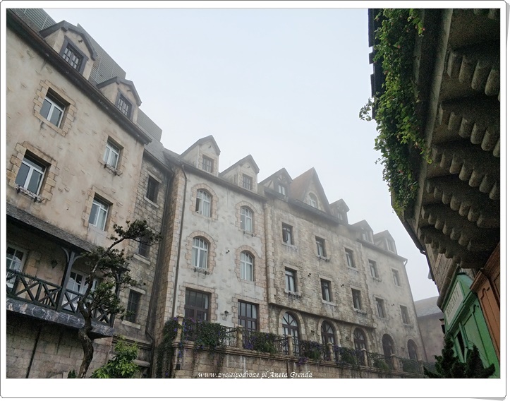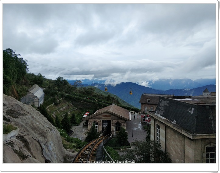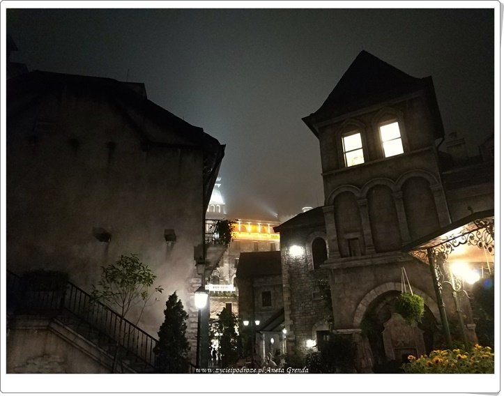 Tak, jak wspomniałam pierwszego dnia najdłuższą linią kolejki udaliśmy się na samą górę. Francuska wioska, która ukazuje się naszym oczom, kiedy wysiadamy z niej, zachwyca architekturą, romantycznością i urokiem budynków, ale też nieco zniechęca tłumem ludzi. Położona jest ona na wysokości 1500 m n.p.m., co potęguje niezwykłe doznania. Masz wrażenie, że przeniosłeś się w czasie i przestrzeni. Już sam nie dowierzasz, czy znalazłeś się we francuskich Alpach, czy górach wietnamskich. Uczucie to staje się jeszcze intensywniejsze wieczorem i nocą, gdy mgła otula całą okolicę, a ciche uliczki, gdyż na noc zostaje niewielka grupa ludzi – inni już dawno zjechali w dół, wyglądają mrocznie. Mury, budynki, kostka brukowa przenoszą nas w inną epokę. Niedowierzam sama, że wciąż jestem w Wietnamie.