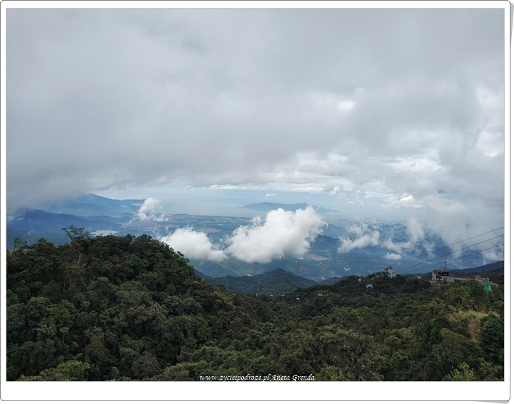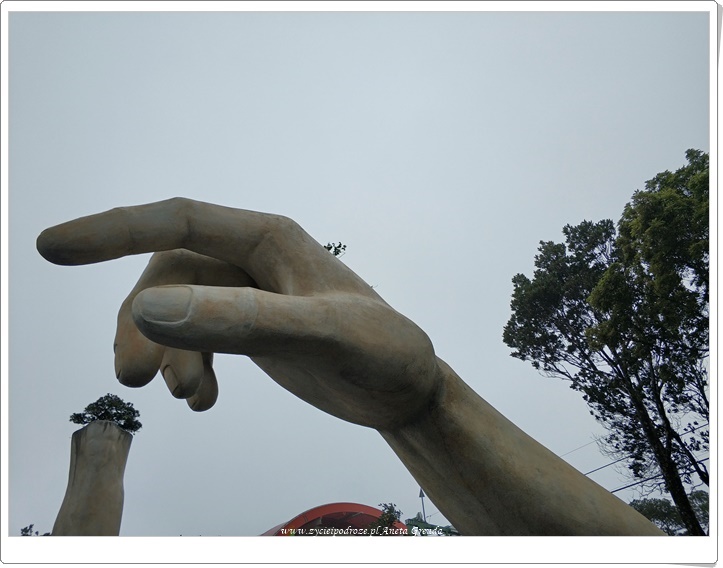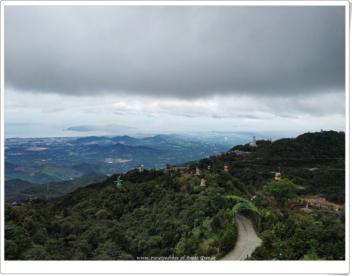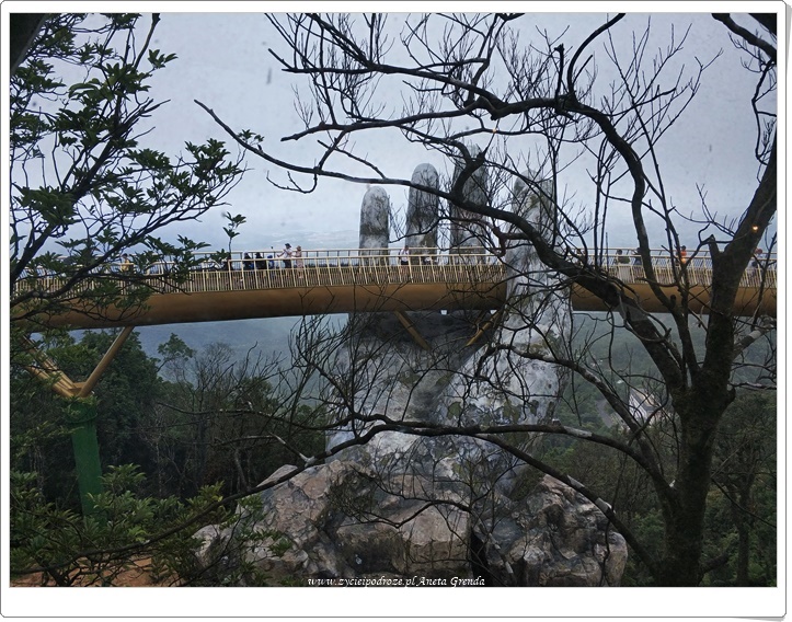 Następnego dnia po krótkim spacerze udajemy się na śniadanie do wyznaczonej restauracji. Nie jesteśmy zachwyceni. Te wczorajsze znacznie bardziej przypadły nam do gustu. Ten element był zdecydowanie ujemny, a restauracja dość zatłoczona i niezbyt czysta. Zatem dość szybko opuściliśmy ją, aby nie psuć sobie obrazu Ba Na Hills. Zjeżdżamy kolejką linową ze stacji Louvre do przystanku Bordeaux. Stąd podziwiamy Złoty Most – Cầu Vàng podtrzymywany Olbrzymimi Dłońmi. Został oddany dopiero w czerwcu i cieszy się ogromną popularnością. Przyznaję, że i na nas robi wrażenie. Widok rozciągający się z niego jest fantastyczny. Pejzaż górski łączy się z morskim, a Da Nang i jego atrakcje takie jak Lady Buddha, czy też Marble Mountains są doskonale widoczne pomimo chmur zwiastujących deszcz. Tutaj spędzamy sporo czasu.