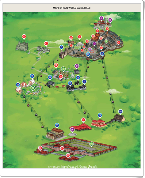 Poniżej dla lepszej orientacji zamieszczam mapę, aby łatwiej można było wyobrazić sobie rozmach tego wyjątkowego projektu i lokalizację poszczególnych miejsc. My rozpoczęliśmy naszą podróż od stacji Toc Tien skąd udaliśmy się pierwszego dnia na samą górę, czyli do przystanku L’Indochina. Na tej wysokości spędziliśmy dzień i noc oczarowani atmosferą tegoż miejsca zwłaszcza nocą. Następnego dnia udaliśmy się kolejką linową ze stacji Louvre do przystanku Bordeaux. Stąd po zwiedzeniu cudnych miejsc, o których za chwile opowiem, kolejką torową przejechaliśmy w stronę stacji Debay mijając po drodze zjazd Ba Na. Dotarliśmy znów na górę na stację Morin. Po obejrzeniu cudnego spektaklu i skosztowaniu smakołyków w restauracji Kavkaz zjechaliśmy na sam dół. Dotarliśmy do stacji Hoi An, skąd udaliśmy się na spacer, którym zakończyliśmy nasz pobyt w Ba Na Hills.