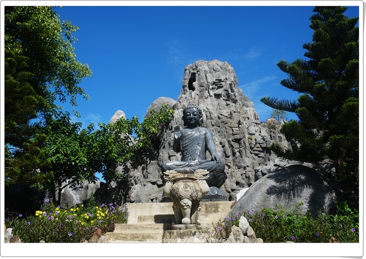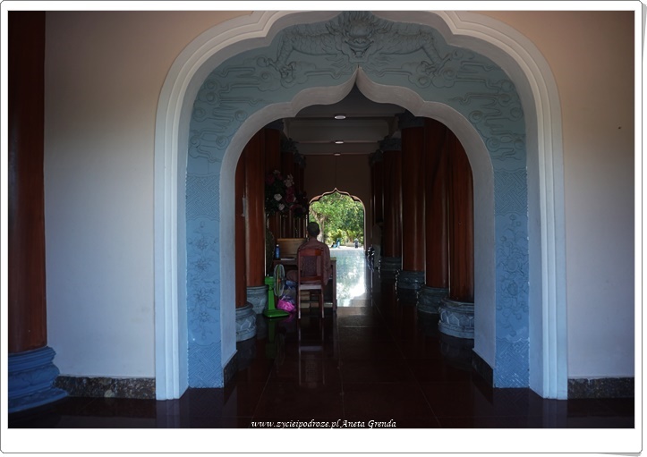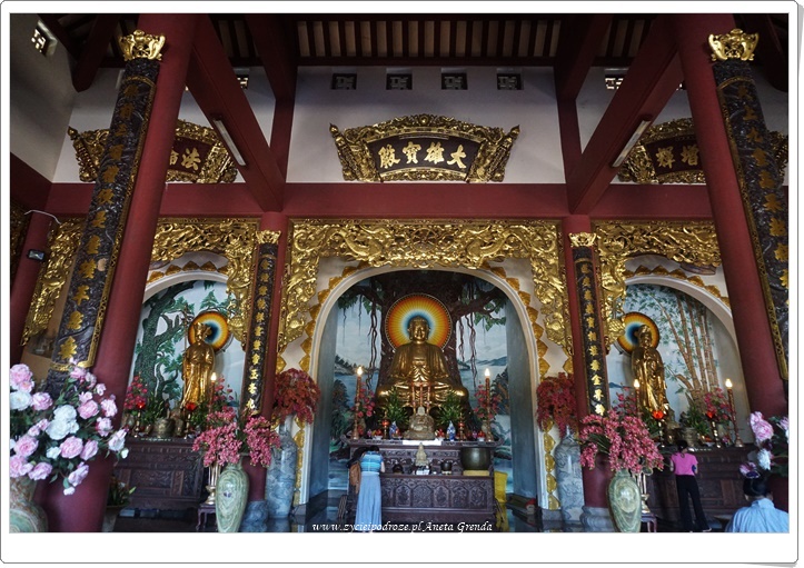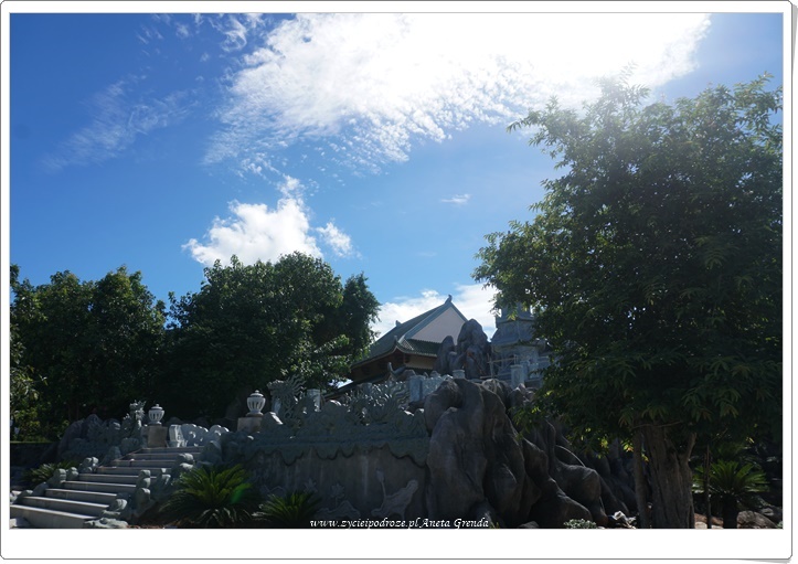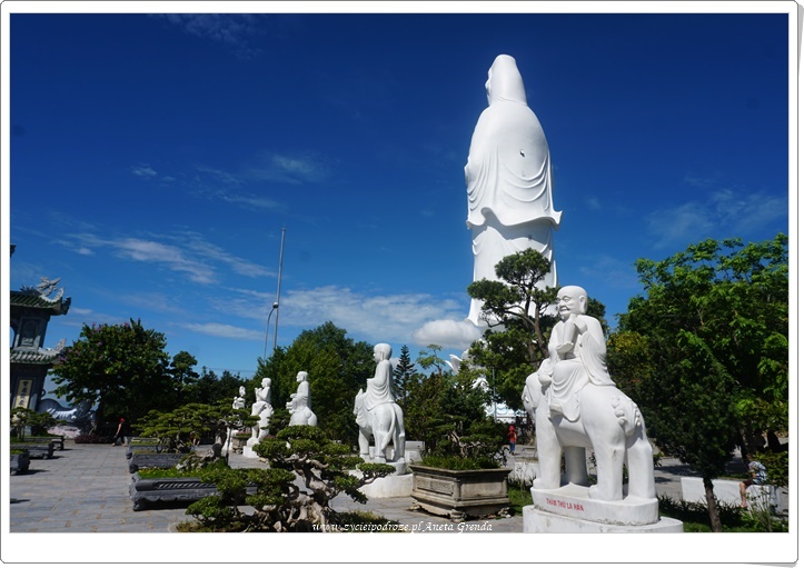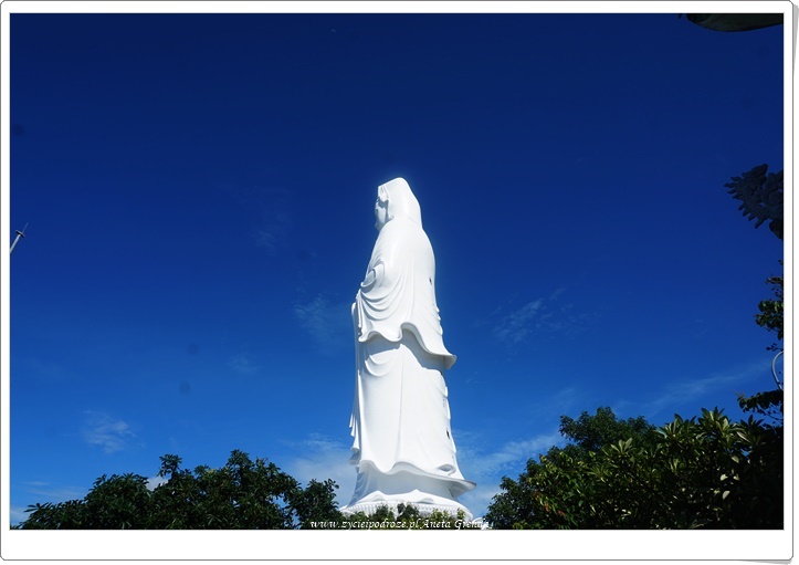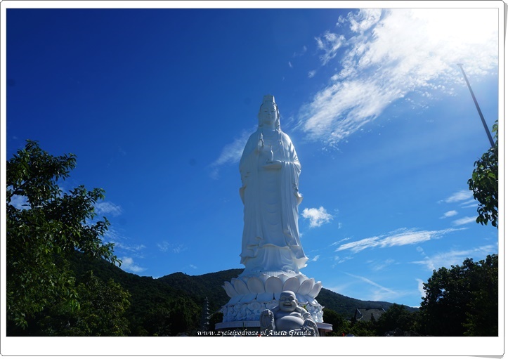 Jednak najbardziej widoczną i spektakularną częścią kompleksu jest najwyższy w Azji Południowo-Wschodniej posąg Bodhisattwy Awalokiteśwary – Bogini Miłosierdzia. Lady Budda ma wysokość 67 metrów, a średnica samego lotosu aż 35. W jej wnętrzu znajduje się 21 małych rzeźb Buddy. Rozmieszczono je na 17 piętrach. Jest to przykład architektury buddyzmu Phat Trung Huu Phat. Z wyżej wymienionych pięter można zobaczyć całe miasto Da Nang, plaże, morze i wyjątkowe Marble Mountains, o których pisałam we wpisie https://www.zycieipodroze.pl/2018/08/17/marble-mountains-wyjatkowe-wzgorza-pieciu-zywiolow/. Widok jest niezwykły, a błękit nieba potęguje doznania.
