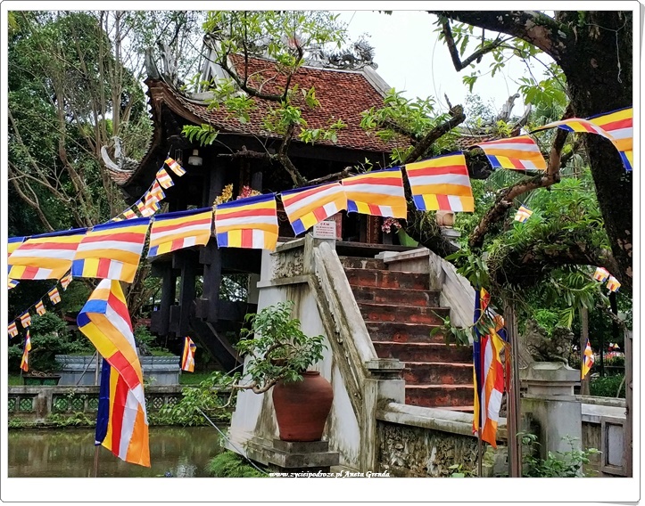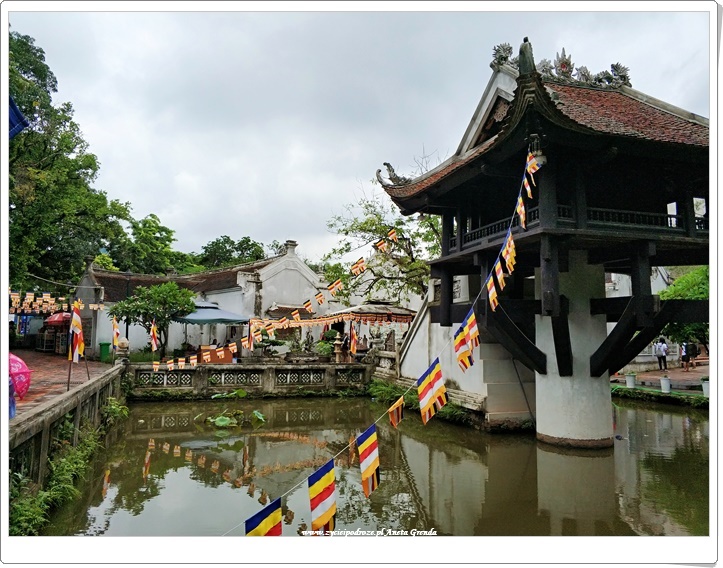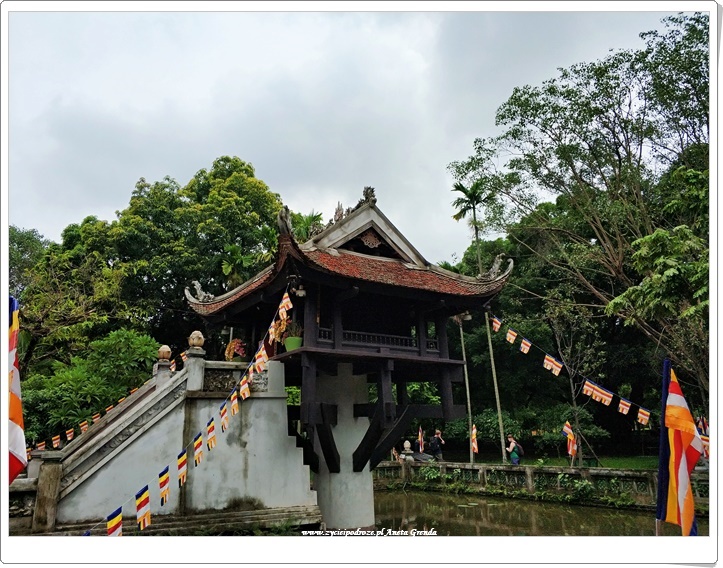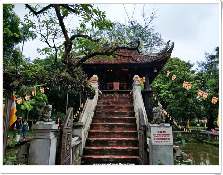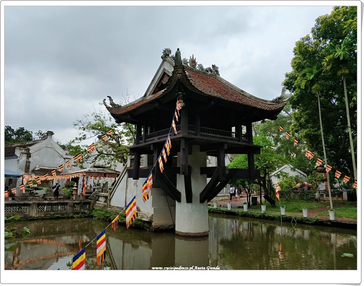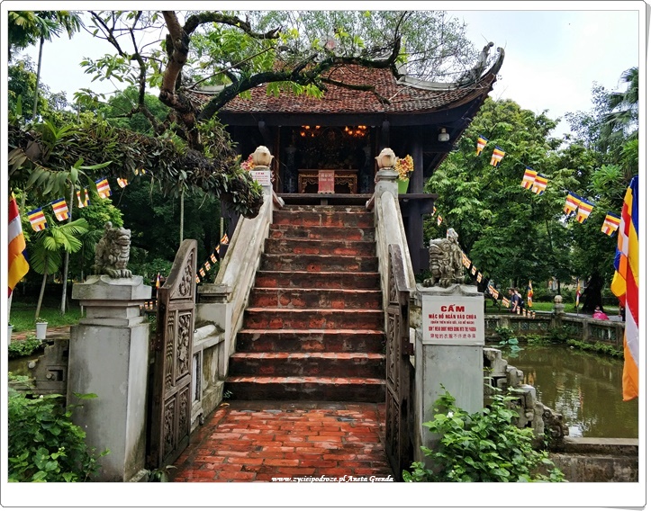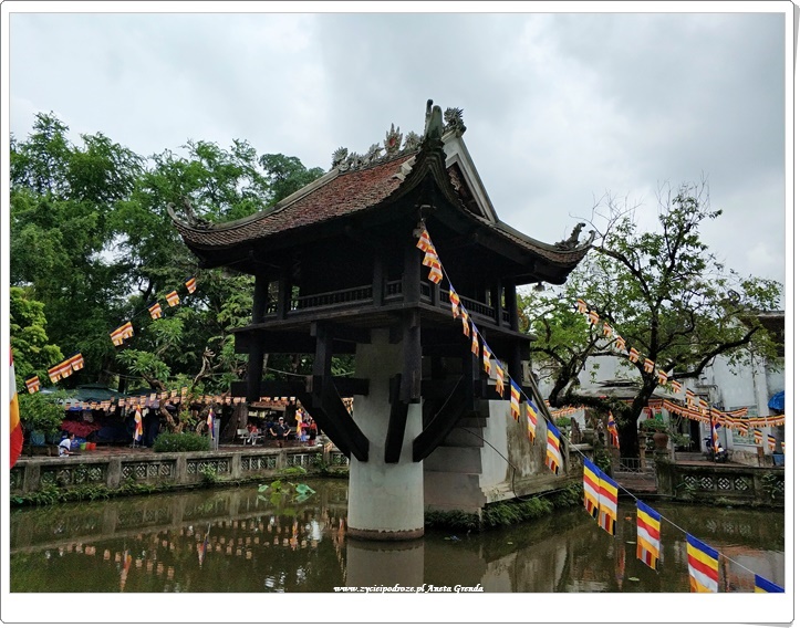 Władca postanowił w dowód wdzięczności wybudować świątynię. Miała ona mieć kształt lotosu wyrastającego z wody, tak jak obraz, który zobaczył we śnie. Stąd usytuowano ją na jednym filarze po środku stawu w zachodnim ogrodzie Cesarskiej Cytadeli, o której wspominam w poście https://www.zycieipodroze.pl/2018/10/25/cesarska-cytadela-w-hanoi-i-jej-historia/. Ogród charakteryzował się starożytną architekturą i dbałością o szczegóły krajobrazu. Służył do rekreacji i wypoczynku. Wokół filaru służącego jako noga do podparcia świątyni znajdowały się zakrzywione żelazne pręty do podpierania drewnianej podłogi. Dzięki temu cała pagoda wyglądała jak lotos wynurzony z wody. Pozostaje do dziś symbolem czystości, gdyż kwiaty lotosu rosnące w błotnistym stawie według buddyzmu mają takie znaczenie.