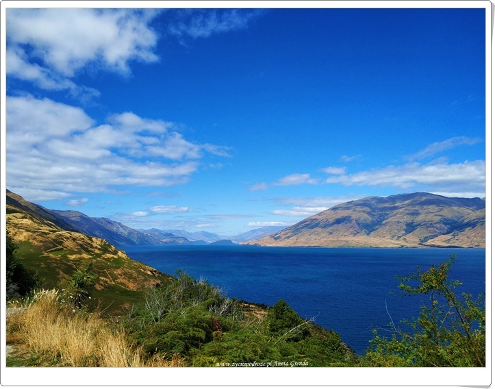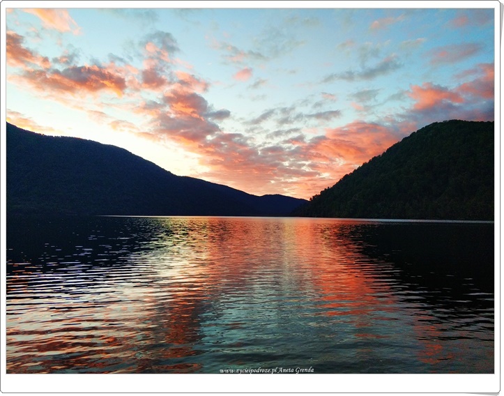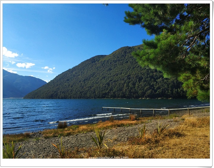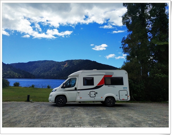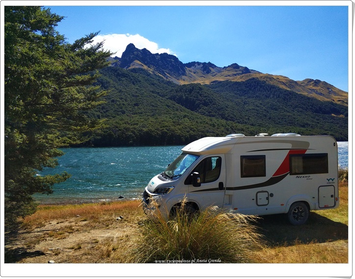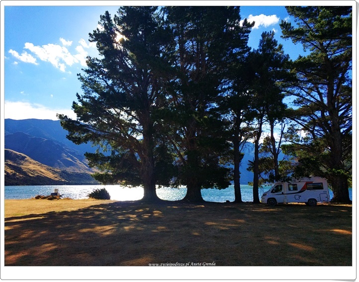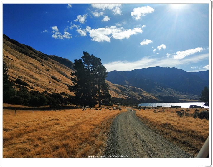 Droga szutrowa nie należała do najłatwiejszych, ale widoki, przestrzeń ogromna, przepiękna przyroda i niemalże brak ludzi dookoła warte były jej pokonania. Ku naszej ogromnej radości dotarliśmy do jeziora ,,na końcu świata,, i tutaj spędziliśmy czas z dala od wszystkiego i to dosłownie. Tutaj w Nowej Zelandii bardzo nam się podobały te kilkunastogodzinne przerwy w braku zasięgu. Dodały one naszej podróży niewątpliwie uroku. To wspaniałe uczucie móc skupić się tylko na tym, co dookoła nas i na sobie nawzajem. Piękny, magiczny i wyjątkowy czas, a dzisiejsze emocje i przeżycia niezapomniane. Chciałoby się rzec: chwilo trwaj …