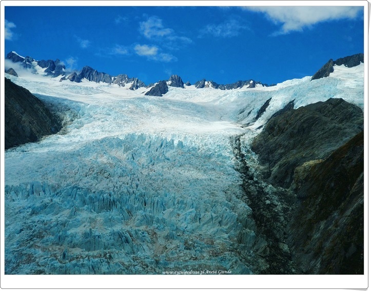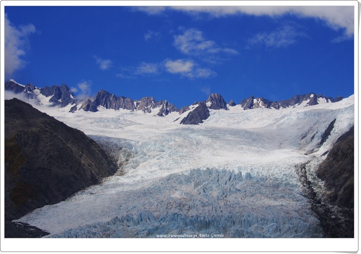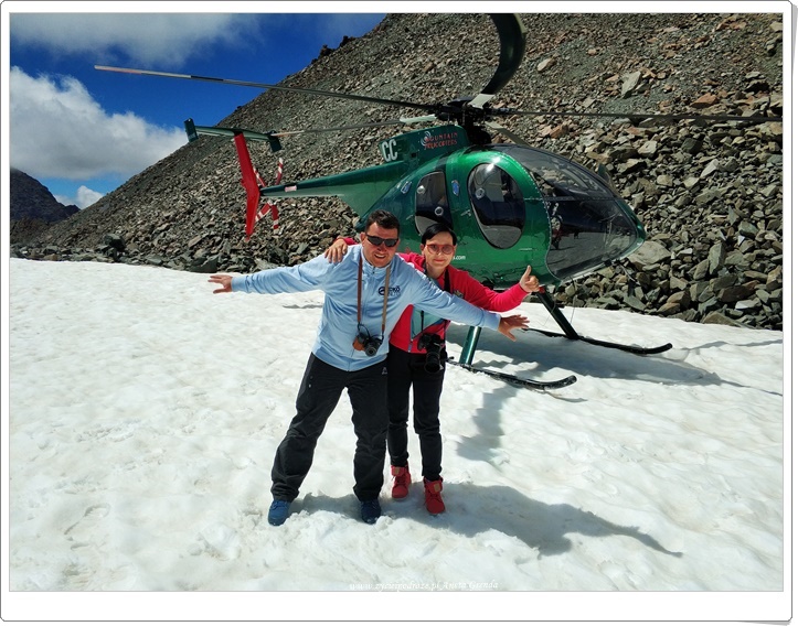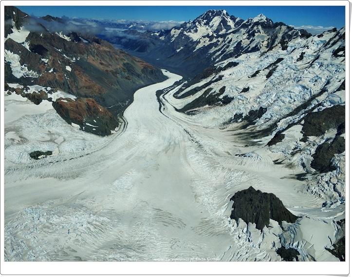 Nasza magiczna podróż wciąż trwa. Jakże to ekscytujące. My, kamper i Południowa Wyspa Nowej Zelandii … Niezwykły dzień pełen wrażeń. Wyjątkowe doznania i spektakularne widoki. Tym razem z innego poziomu. Ekscytujący lot helikopterem i magiczne spotkanie ze szczytami gór, z białym mięciutkim puchem, nadzwyczajnie pięknymi i ogromnymi lodowcami oraz jeziorami morenowymi o niezwykłych barwach. Niesamowite lodowce: Fox Glacier, Franz Josef Glacier oraz największy spośród nich Tasman Glacier urzekły nas i przyciągały wzrok. Mieniły się różnymi kolorami. Połączenie bieli z błękitem wyglądało wprost niebiańsko w promieniach słońca. Choć, gdy ono skryło się za chmurami nasz zachwyt wciąż nie malał. Jaka szkoda, że lodowce topnieją na skutek zmian temperatury i zmniejszają swoją objętość.