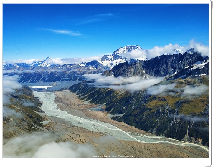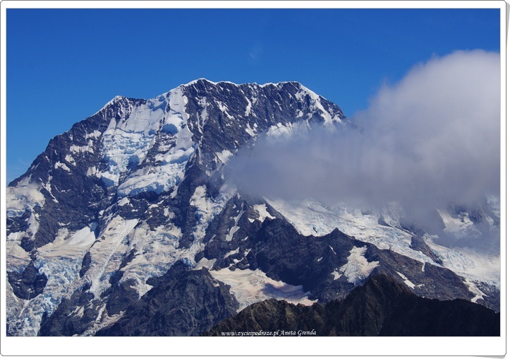 Majestatyczna i bardzo charakterystyczna góra Mount Cook zauroczyła nas od pierwszego wejrzenia. Pomyśleć tylko, że mogliśmy to wszystko podziwiać z tak bliska. Cudny pejzaż górski rozciągał się przed naszymi oczami radując je swoim nadzwyczajnym pięknem i wyjątkowością. To był cudny dzień pełen niezapomnianych wrażeń, niesamowitych przeżyć i niezapomnianych chwil. Dla nas, zakochanych w górach, to była niezwykła przygoda, a Alpy Południowe zachwycające. Na chwilę wróciliśmy myślami do naszego himalajskiego trekkingu. Dziś, choć w inny sposób, bo wykorzystując helikopter, dotarliśmy do pięknej górskiej krainy, aby podziwiać ją w całej okazałości.