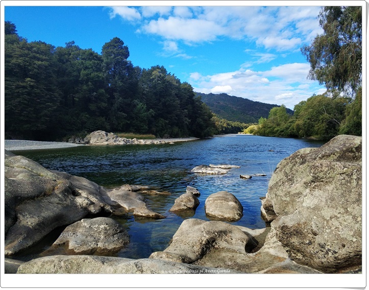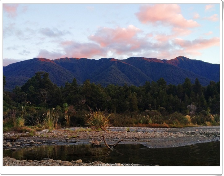 Żegnając się z morzem udaliśmy się w głąb lądu, aby dotrzeć do planowanego postoju nad jedną z rzek. Ku naszej radości miejsce było piękne. Można było pospacerować i pokąpać się w rzece. Oczywiście nie omieszkaliśmy też powędkować wieczorową porą. Mój mąż złapał ślicznego pstrąga, który był uwieńczeniem kolejnego wyjątkowego dnia naszej podróży. Oczywiście po otrzymaniu buziaka wrócił do wody. Zastanawialiśmy się co czeka nas jutro, gdyż zamierzaliśmy udać się w stronę przeciwnego wybrzeża Południowej Wyspy Nowej Zelandii.