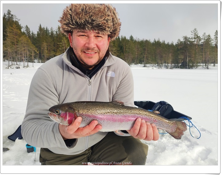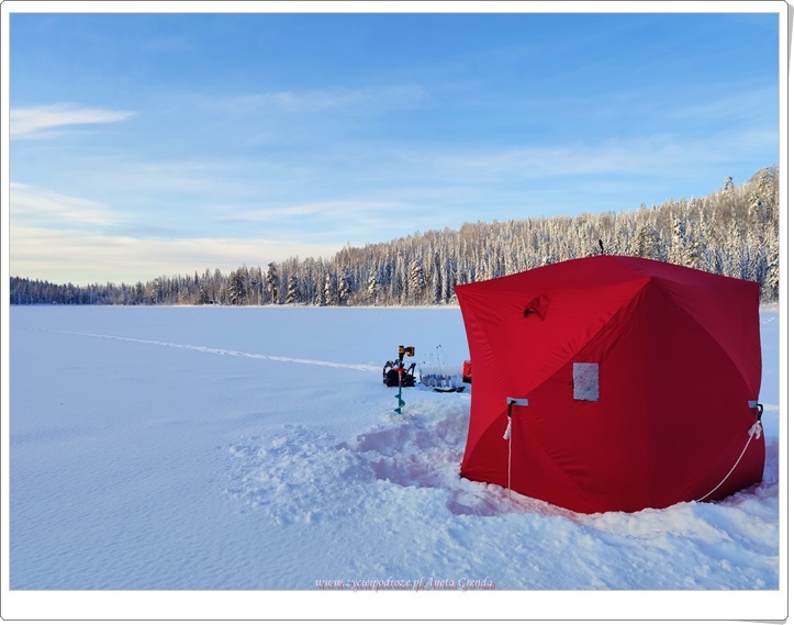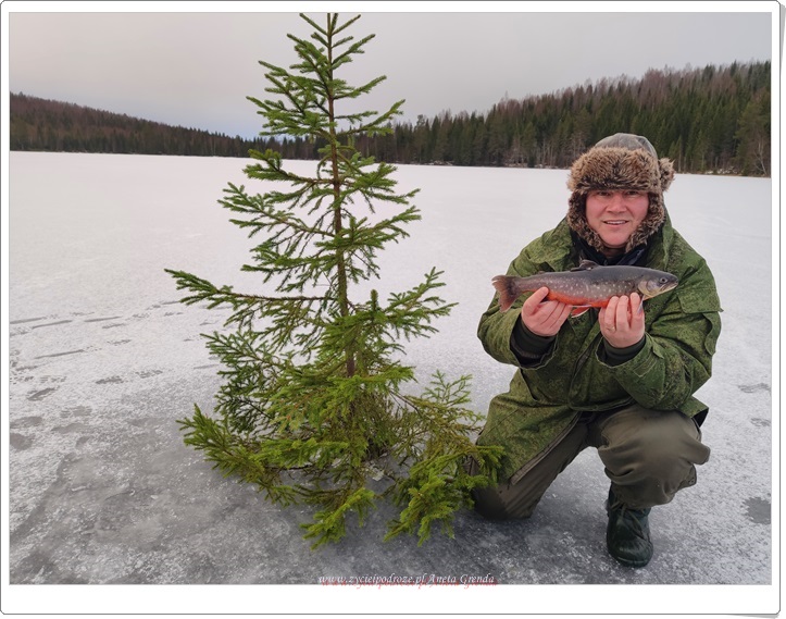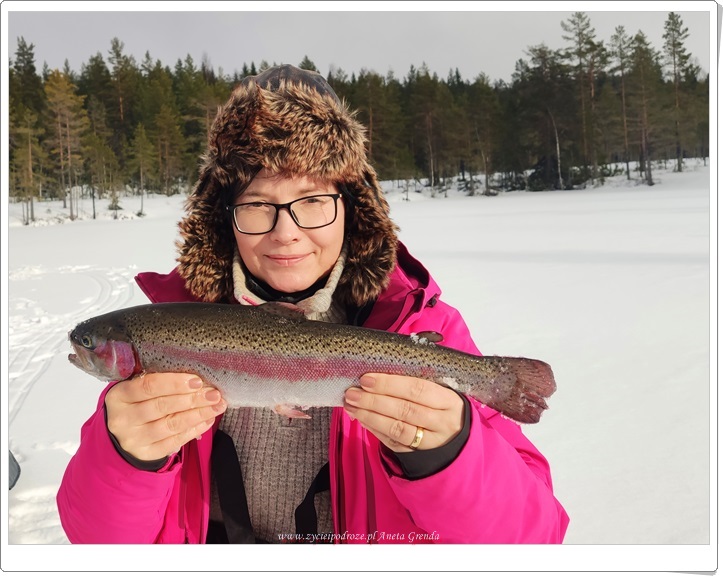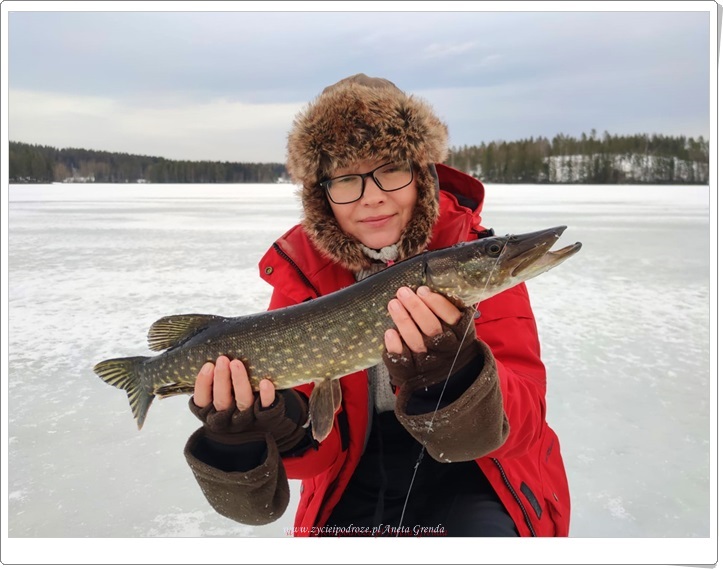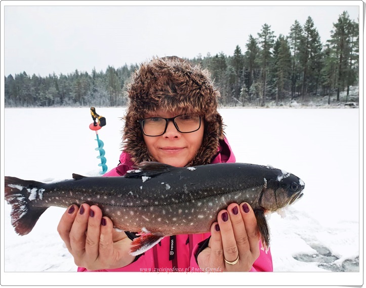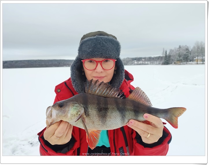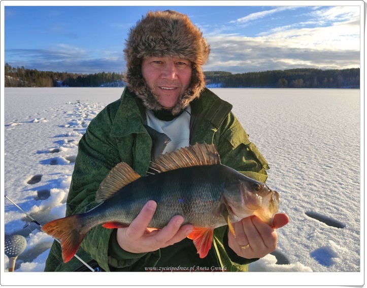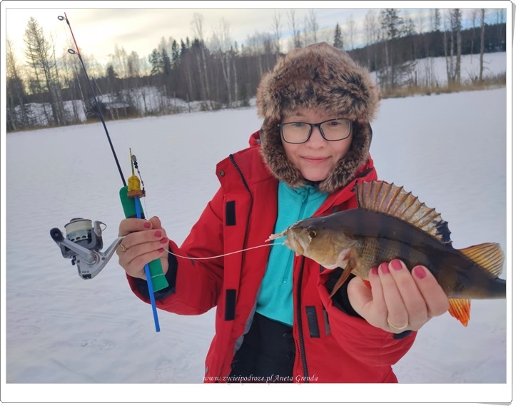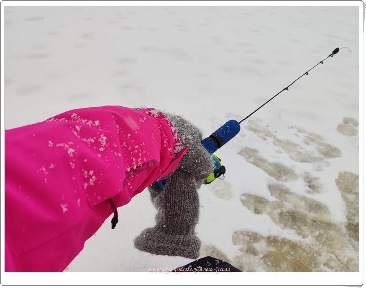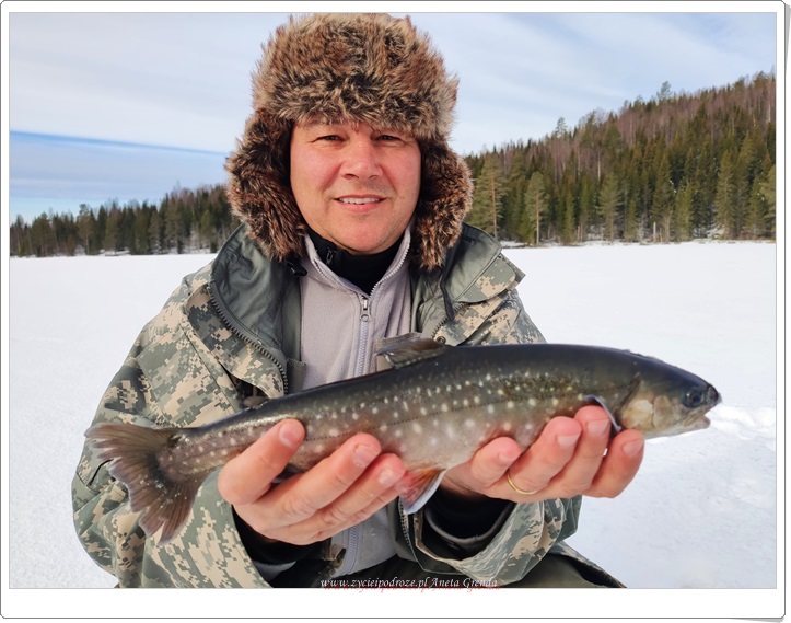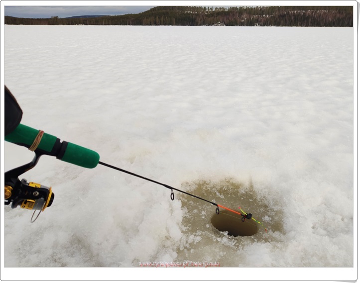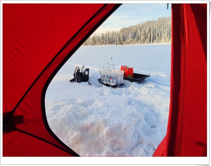 Co do wędek to w wędkarstwie podlodowym wykorzystuje się zupełnie inne niż w sezonie wiosenno-letnio-jesiennym. Charakteryzują sie one tym, że są znacznie krótsze i to niezależnie od sposobu wędkowania. Rozpoczynając od najkrótszych wędek typu Bałałajka lub Kanadyjka (20-30 centymetrów), poprzez wędki z kołowrotkiem do połowu na mormyszkę, aż po wędki do wędkowania na spławik i blaszkę lub balansówkę (30-50 centymetrów). Najdłuższe nie przekraczają 80-90 centymetrów i stosuje się je tutaj w Szwecji do połowu na żywca. Każdy dobiera wędki według uznania i metod wędkowania. Wśród najpopularniejszych metod wyróżniamy mormyszkę, spławik, błystkę podlodową oraz mniej popularne w Polsce, ale jakże skuteczne na szwedzkie pstrągi błyskające i refleksujące światełka. My uwielbiamy najsubtelniejszą pośród nich, czyli mormyszkę, choć inne sposoby wykorzystujemy też dość często. Z tym, że mój mąż wybiera najcześciej Bałałajki, a ja z kolei krótkie wędki z kołowrotkiem. Pomimo, że sposób wędkowania ten sam to styl już inny, dopasowany do osobowości wędkującego i jego preferencji. Wszystkie elementy sprzętu wykorzystywanego w wedkarstwie podlodowym są wykonane z lekkich i niezamarzających materiałów dostosowanych do trudnych warunków atmosferycznych. My wędkowaliśmy w temepraturze -20 stopni, co prawda siedząc w namiocie zimowym, i wszystko działało jak należy.