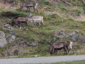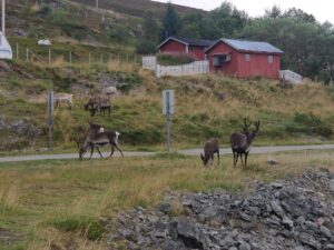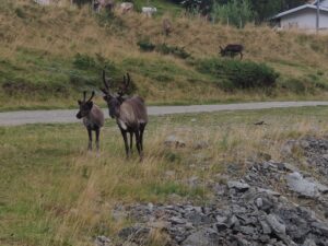 Renifery towarzyszą nam często w naszych podróżach po Skandynawii. Jednak teraz w Norwegii były niemalże wszędzie. Renifery, renifery i jeszcze raz renifery. Dopiero po opuszczeniu północnej części ustąpiły one miejsca owcom. Wszystkie one czują się bardzo swobodnie w okolicy dróg, choć niektóre przebywają za ogrodzeniami mniejszymi, czy większymi. Inne zwierzęta widzieliśmy sporadycznie podczas naszej norweskiej podróży, ale aż trzy razy widzieliśmy delfiny. Bardzo nas to zaskoczyło, ale i uradowało. Coż to za niezwykły spektakl kiedy wyskakują jeden przez drugiego z wody. Trudno je uchwycić w obiektywie, kiedy z zaskoczenia się pojawiają, ale pozostają w pamięci na długo.